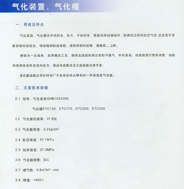 氣化裝置,氣化槽為中間料倉,灰斗,平底料庫,錐底料庫的輔助件。接通過預熱的空氣后,該裝置可使粉狀物料流態(tài)化,增加物料的流動性,使物料卸料流暢。